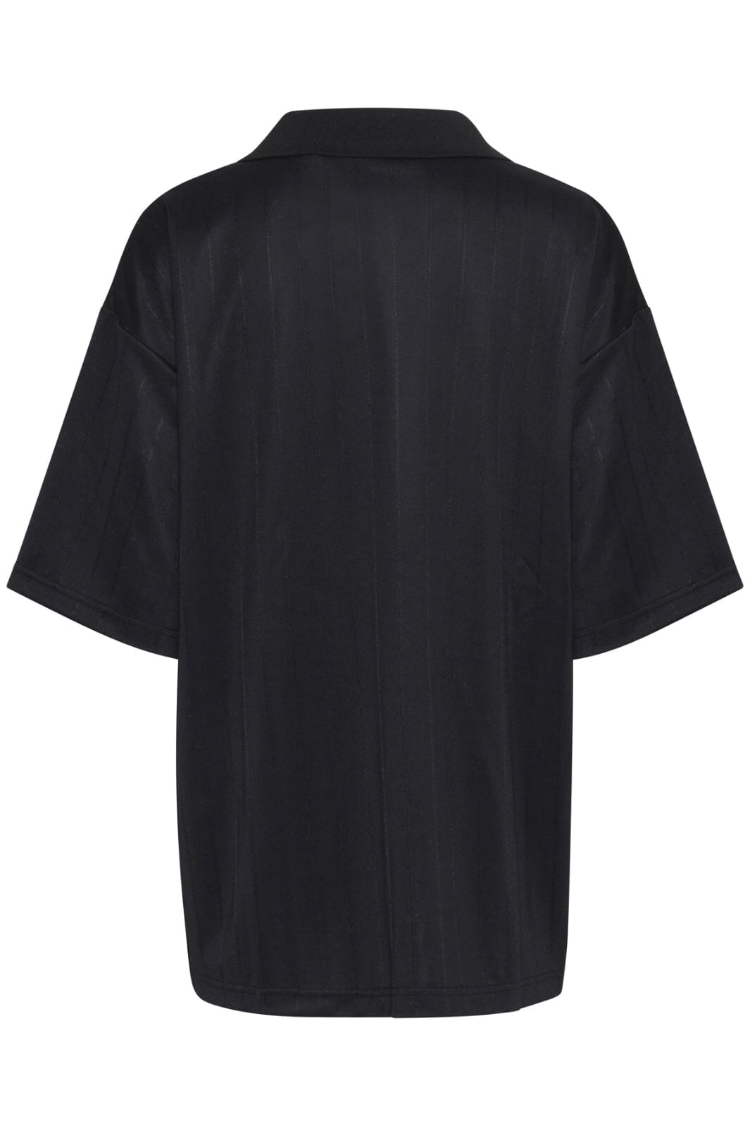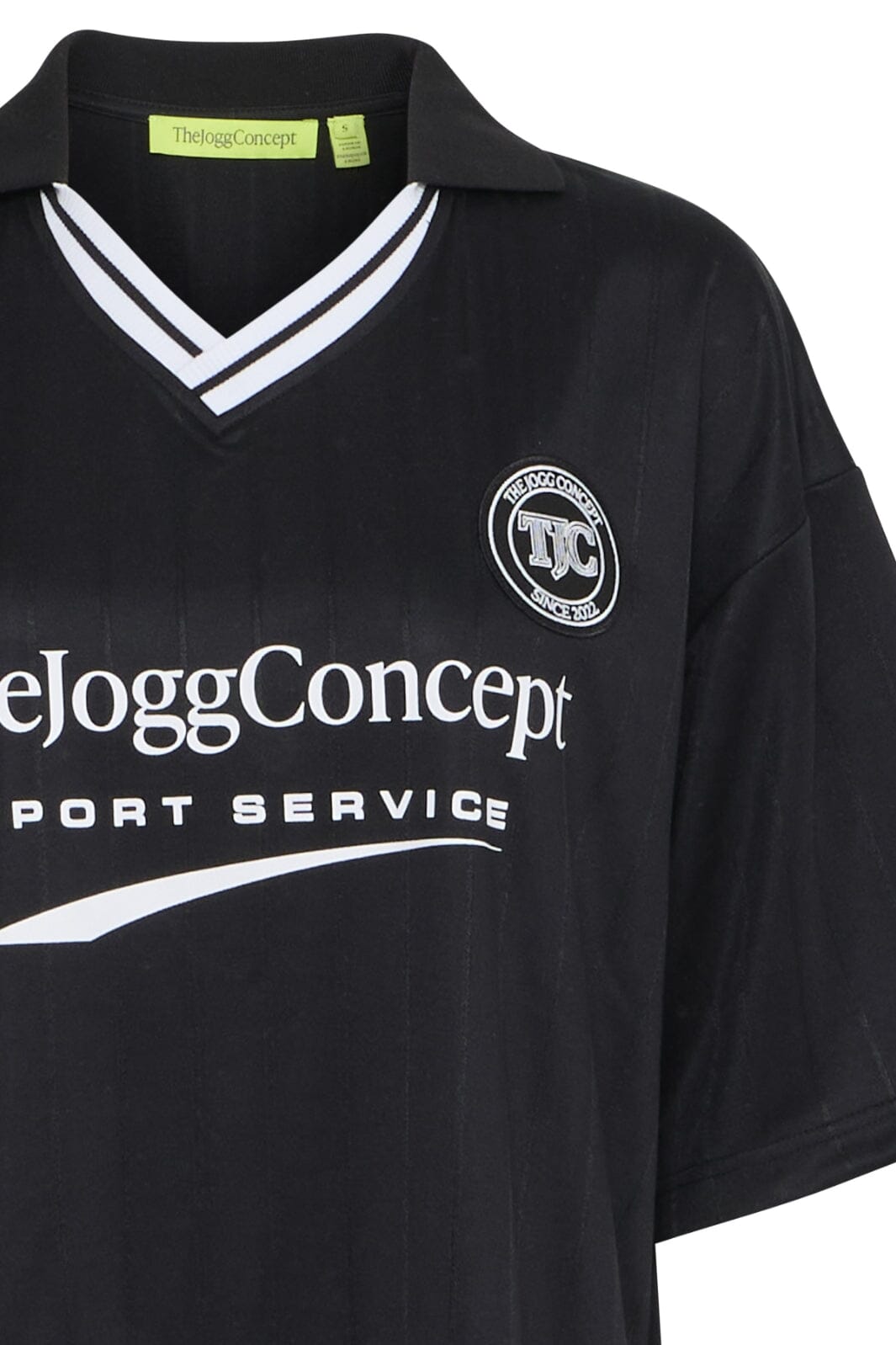Zwarte t-shirt van The Jogg Concept met V-hals en een subtiel gestreept patroon. Het t-shirt heeft een sportieve stijl en is gemaakt van gerecycled polyester.
