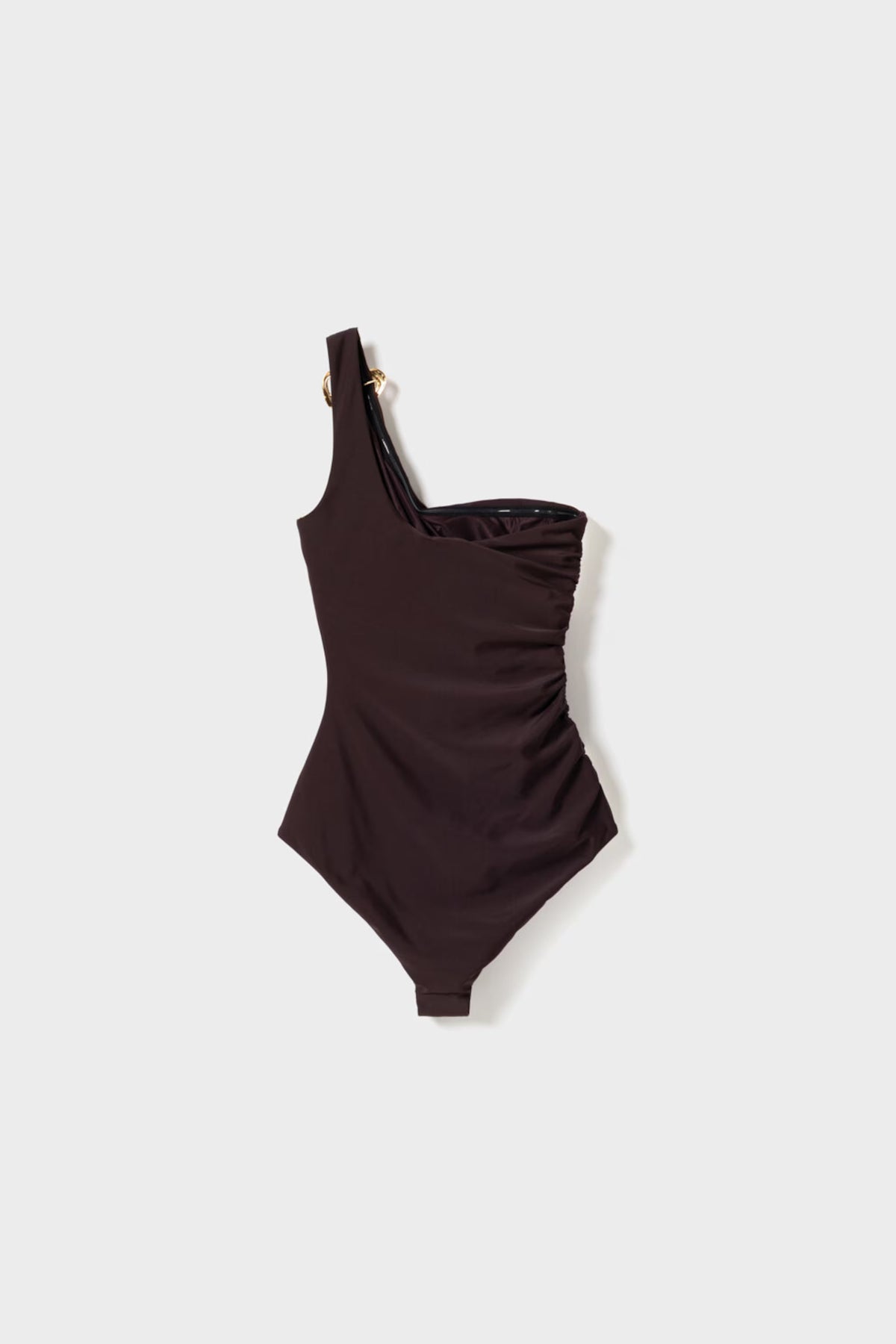 Bruin badpak van Twist & Tango, gemaakt van 80% nylon en 20% spandex. Het badpak heeft een off-shoulder halslijn en een diepe bruine tint.