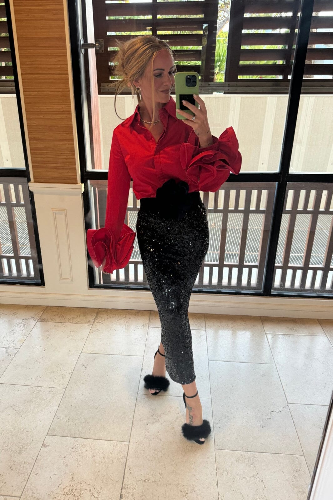 Zwarte rok van Valentin Studio met pailletten. Hij heeft een hoge taille en komt tot halverwege het scheenbeen. De pailletten creëren een glanzend effect op het effen oppervlak.