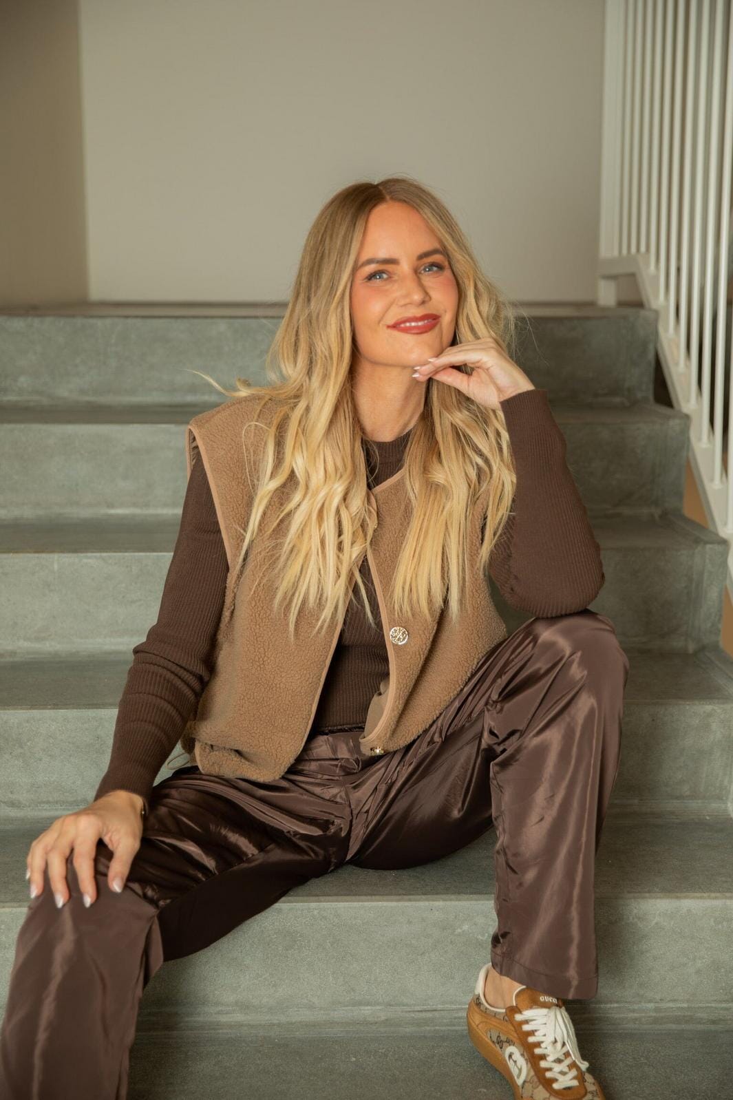 Fluffy bodywarmer van Valentin Studio in een donkerzandkleur. De bodywarmer heeft een mouwloos design met ronde hals en is gemaakt van 100% polyester.