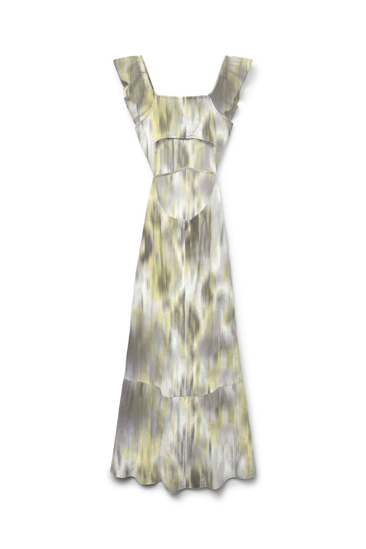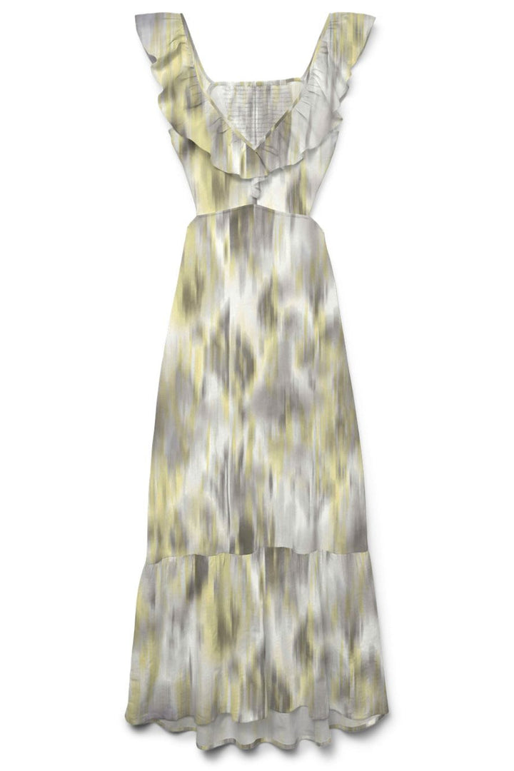 Lange jurk van Vero Moda met meerkleurige print in grijs en witte tinten. De jurk heeft een V-hals, ruchesdetails en een mouwloos ontwerp met een regular fit.