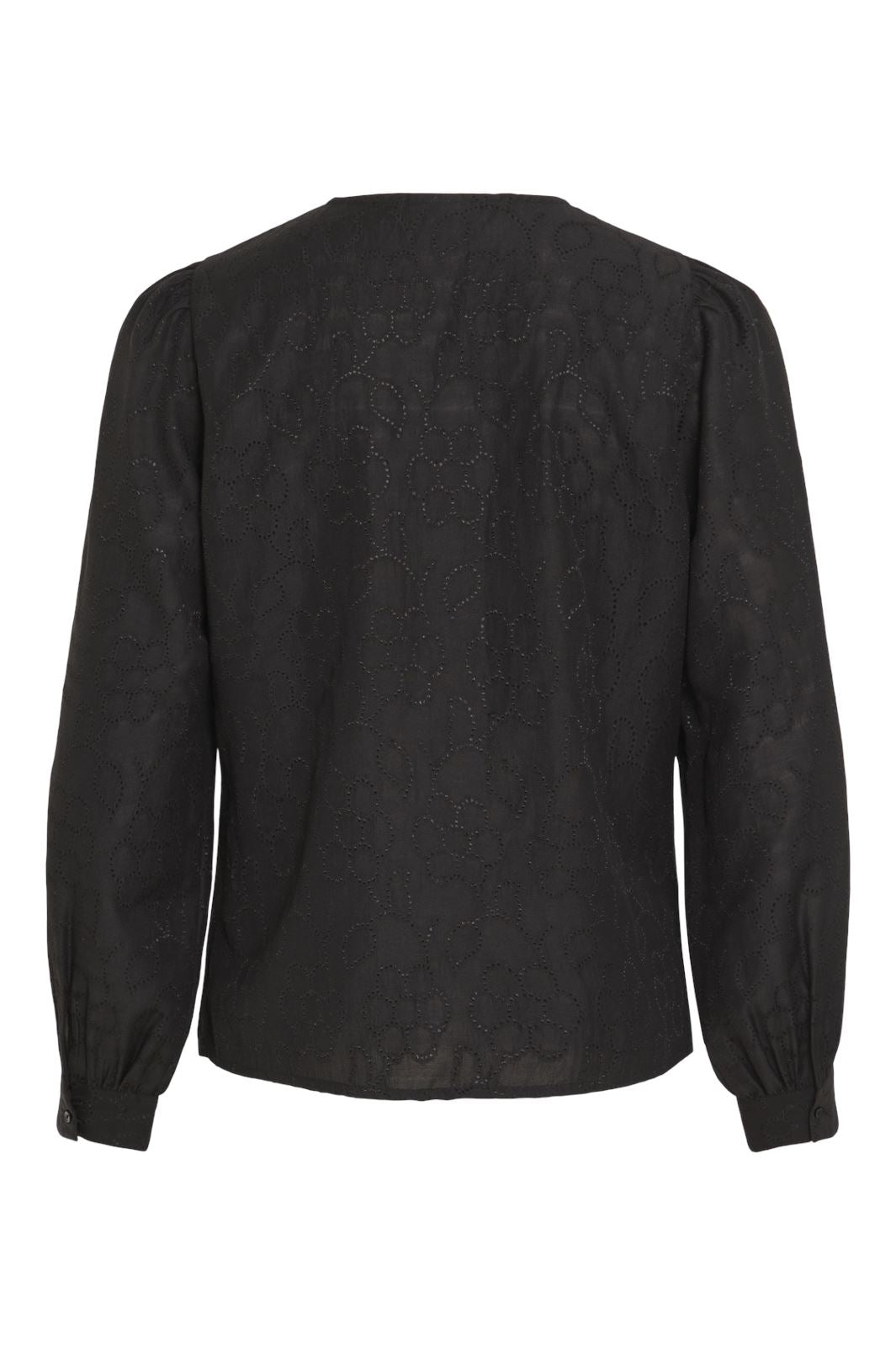 Zwarte blouse van Vila met bloemenpatroon en borduurwerk. De blouse heeft een ronde halslijn en lange mouwen met manchetten. Knoopsluiting aan de voorkant maakt het gemakkelijk om aan te trekken.