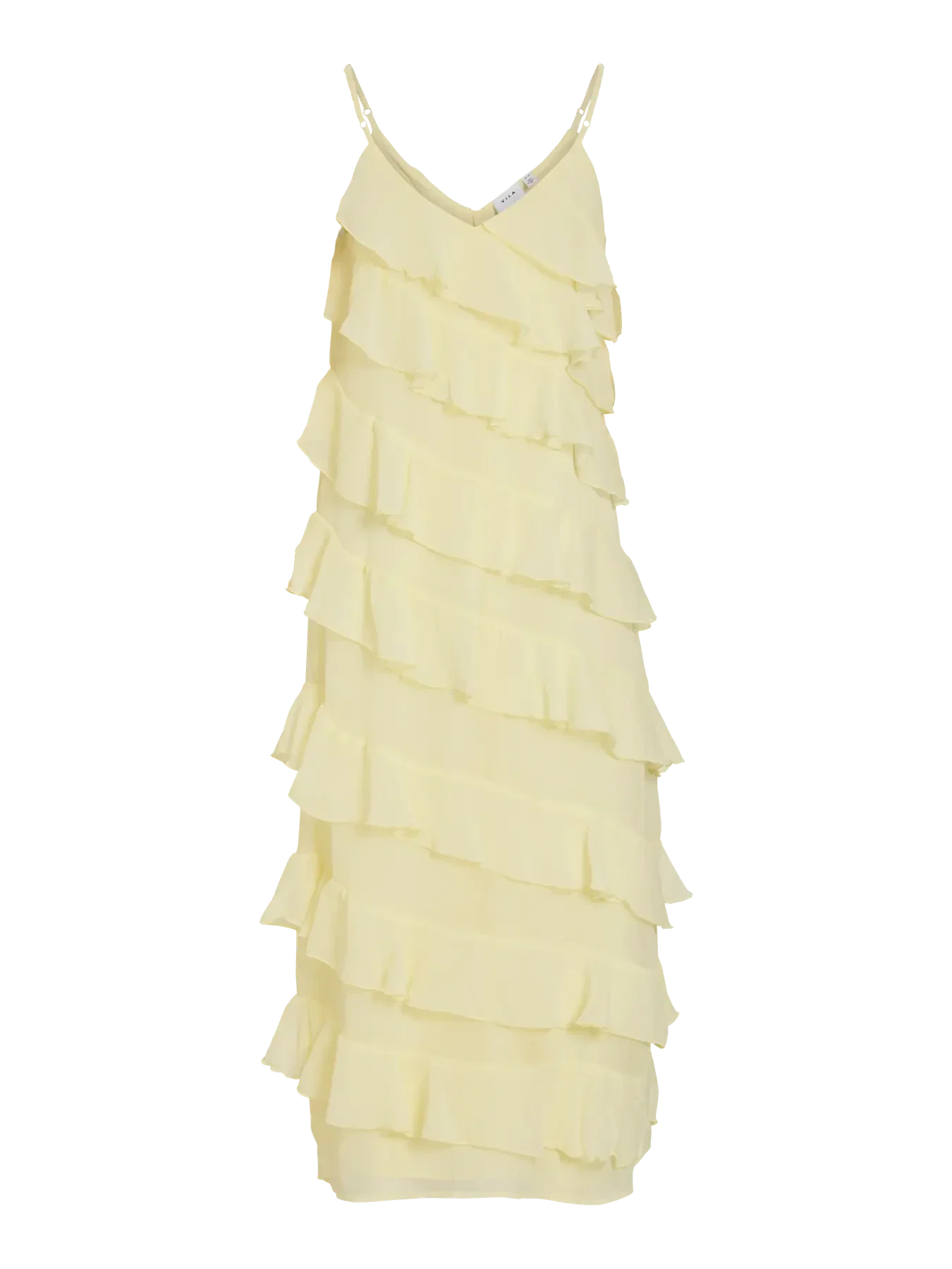 Enkeljurk van Vila in pastelgeel. De jurk heeft dunne bandjes en een V-hals. Hij is gemaakt met meerdere lagen ruches die diagonaal over de jurk lopen.