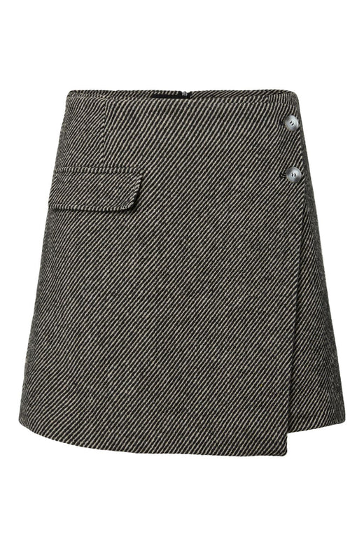 Zwarte rok van Y.A.S met diagonale strepen. Hij heeft een hoge taille en een klepzak aan de voorkant met twee knopen aan de rechterkant.