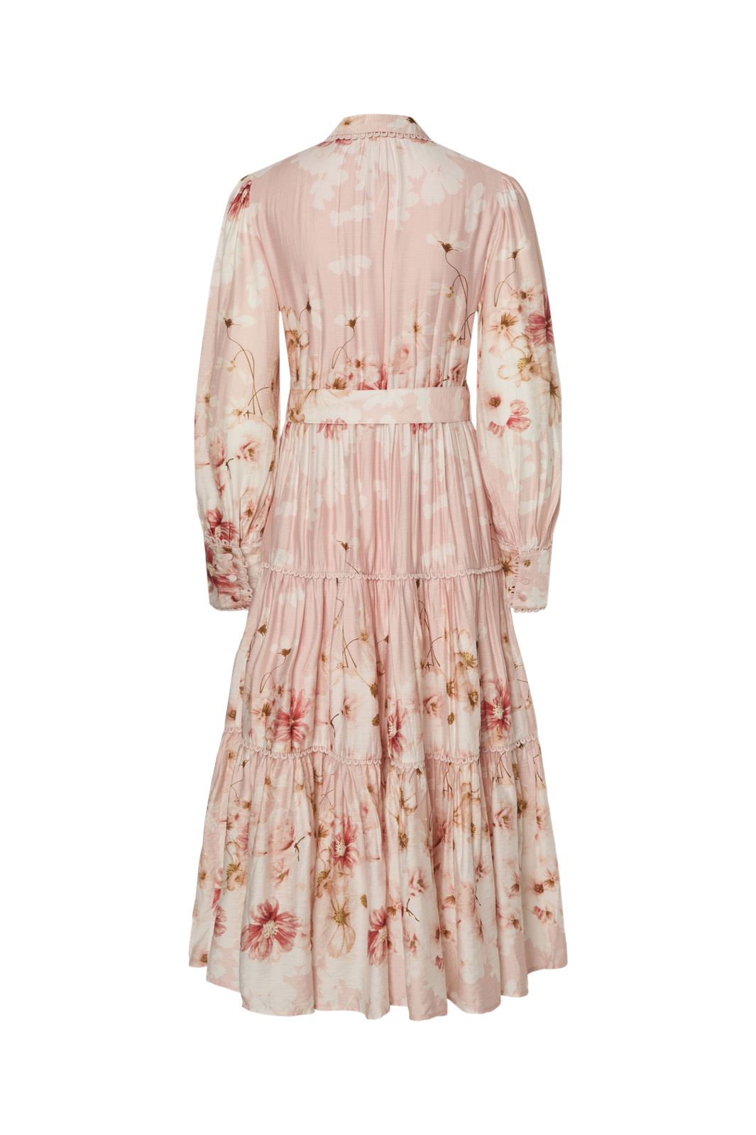 Lange jurk van Y. A.S in roze met bloemenprint. De jurk heeft een overhemdkraag, lange mouwen en ruchesdetails. Hij komt tot halverwege de kuit en heeft een regular fit.