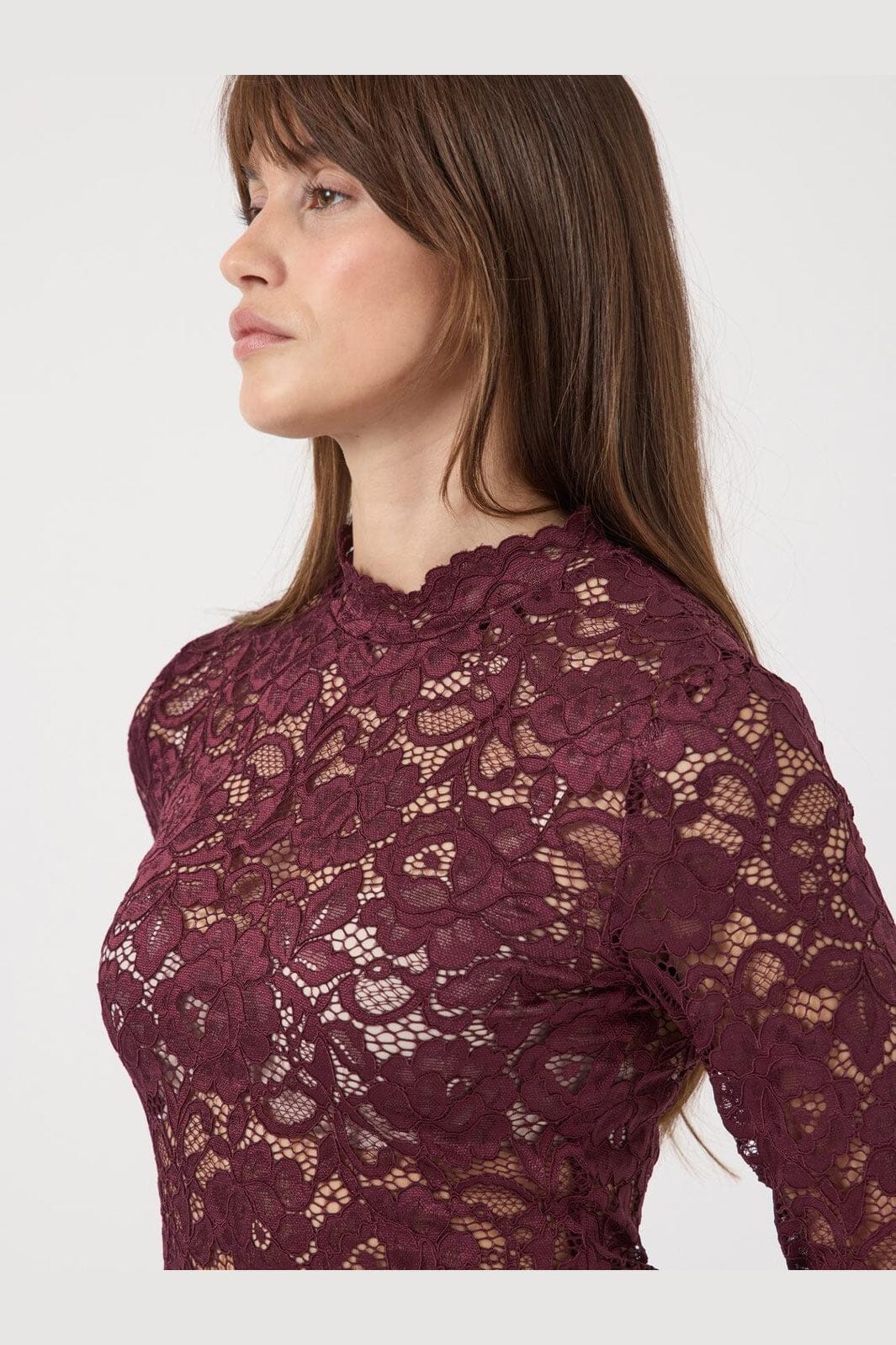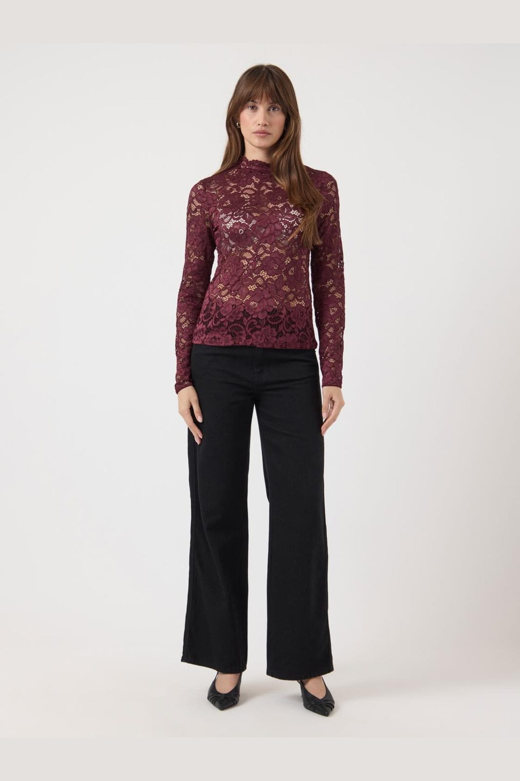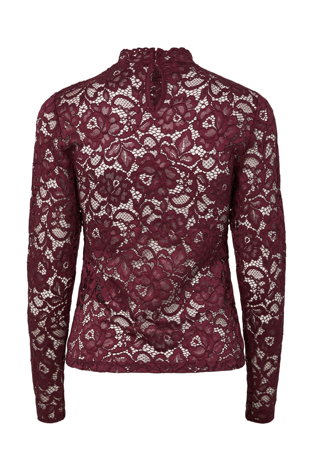 Blondetop van Y.A.S in bordeauxrood met een hoge hals en lange mouwen. De top heeft een bloemenkantpatroon, ruches en een knoopsluiting in de nek.