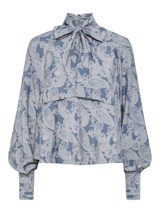 Lange mouwen blouse van Y. A.S in lichtblauw met grijs paisleypatroon. De blouse heeft een hoge hals met strik en pofmouwen met smock-manchetten. Hij sluit met knopen aan de achterkant.