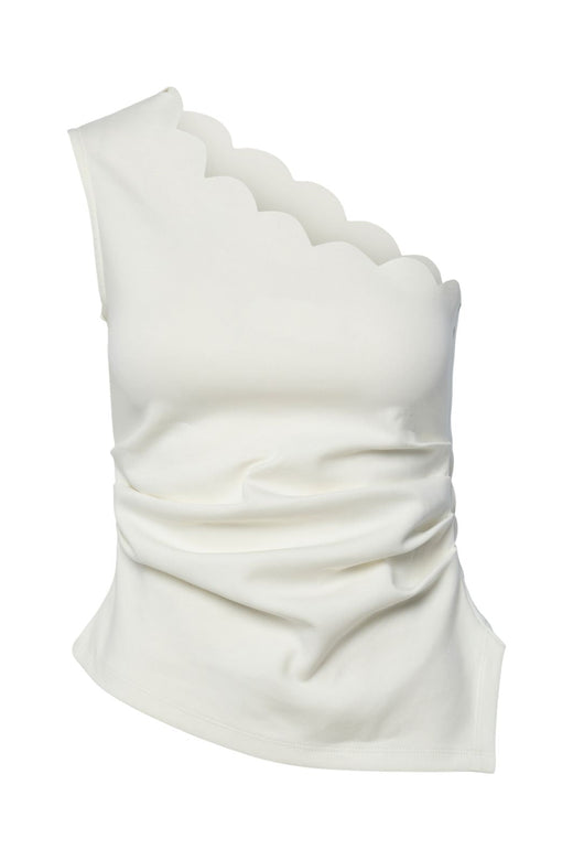 Witte top van Y.A.S met asymmetrisch ontwerp en golvende rand. De top heeft naden bij de taille en een one-shoulder ontwerp met drapering aan de zijkant.