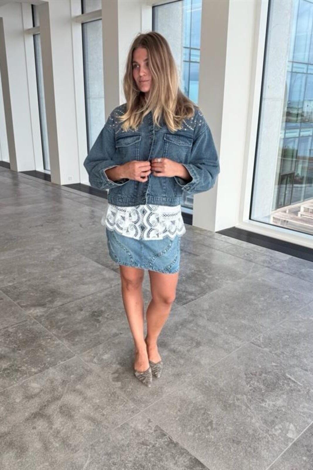 Lichtblauw denimjack van Y.A.S met borduursels en pareldetails. Het jack heeft een losse pasvorm met een overhemdkraag en lange mouwen. Knopen aan de voorkant en twee borstzakken geven het jack een klassieke uitstraling.