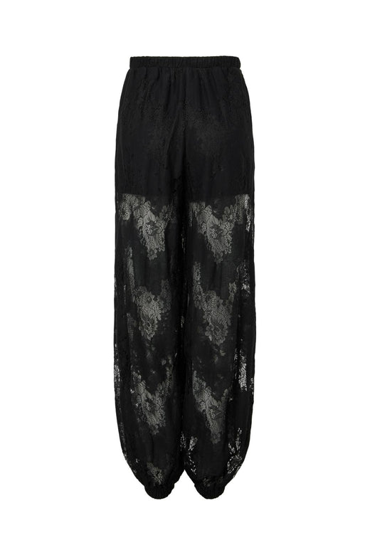 Zwarte ballonbroek van YAS met een bloemenkantpatroon over de hele broek. De broek is geschikt voor feestelijke gelegenheden dankzij de losse pasvorm en enkel-lengte.