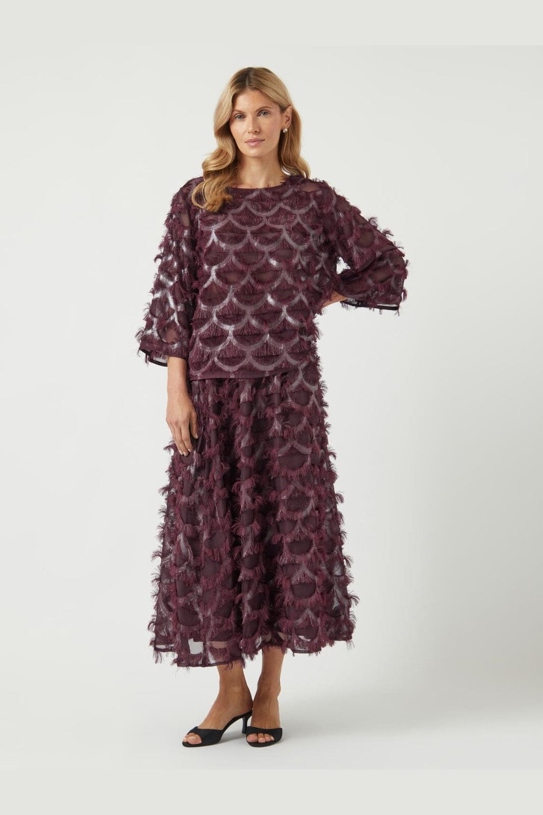 Top van YAS, gemaakt van 100% polyester in een bordeauxrode tint met een metallic glans. De top heeft een patroon van halve cirkels met franjes.