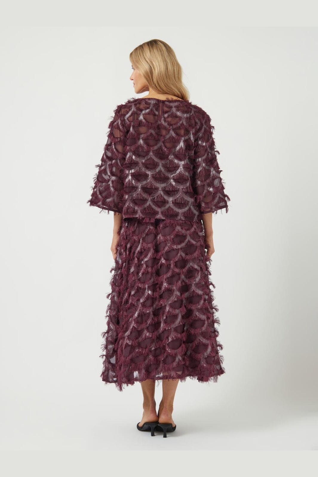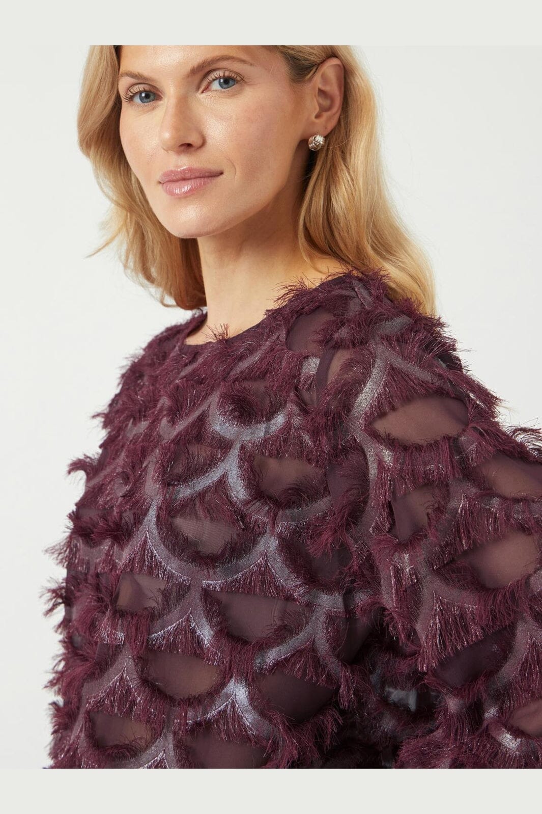 Top van YAS, gemaakt van 100% polyester in een bordeauxrode tint met een metallic glans. De top heeft een patroon van halve cirkels met franjes.