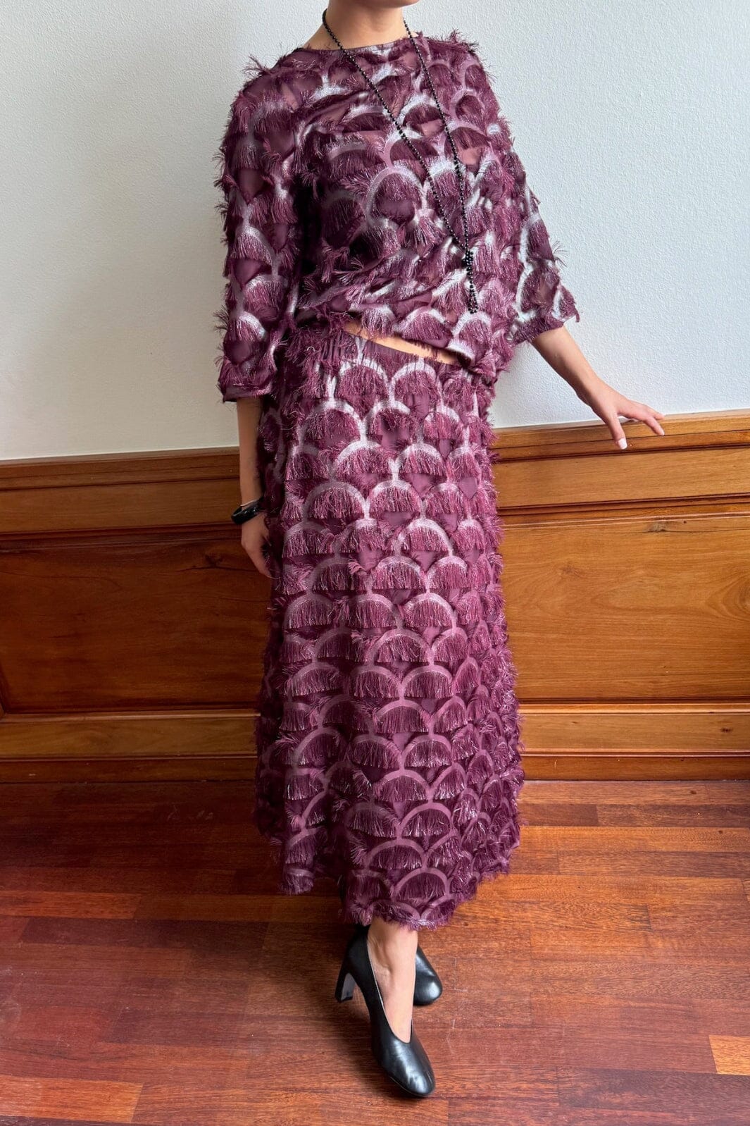 Rok van YAS, gemaakt van 100% polyester in een diepe bordeauxrode tint met metallic print en franjes over het hele oppervlak.