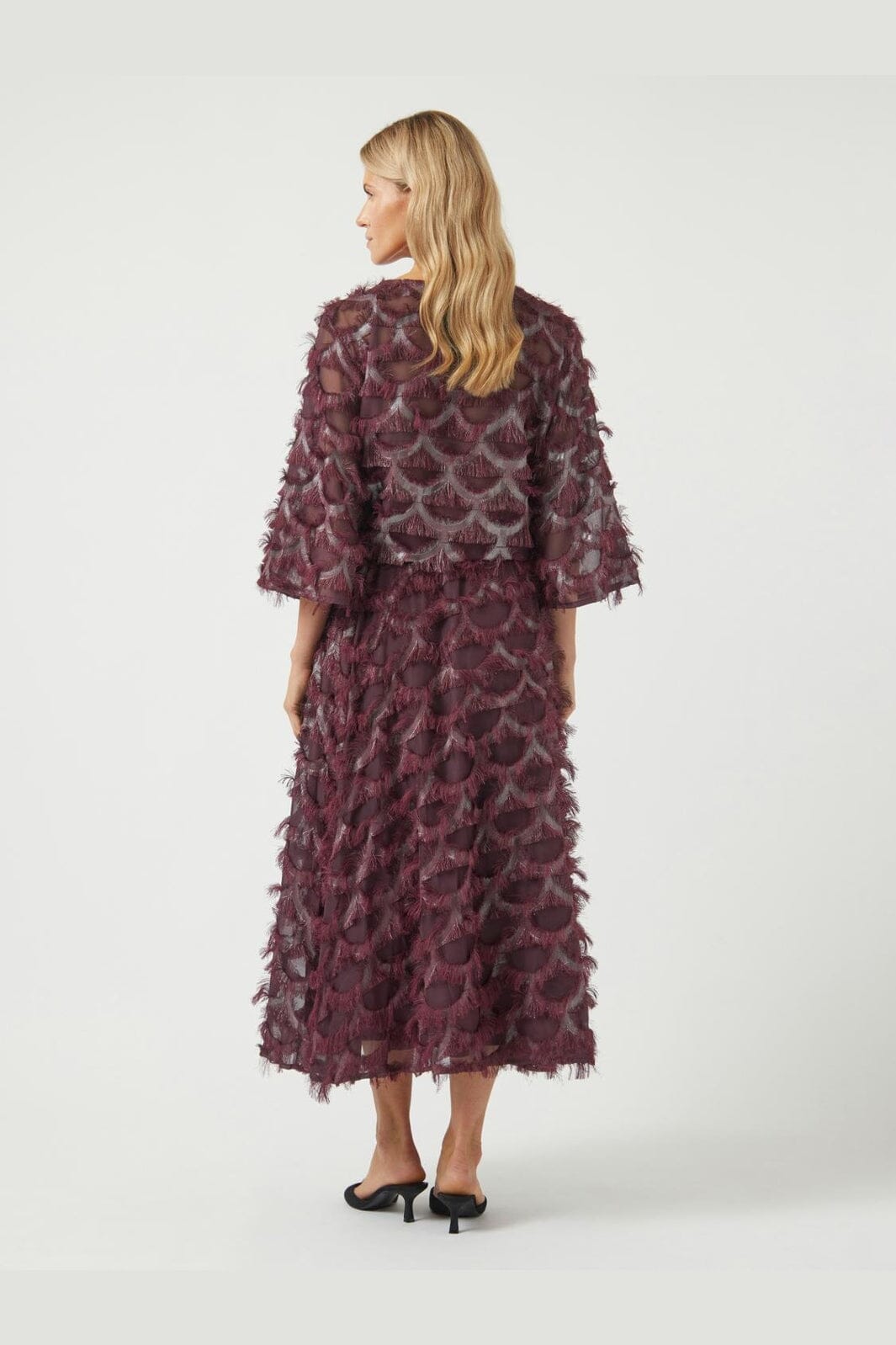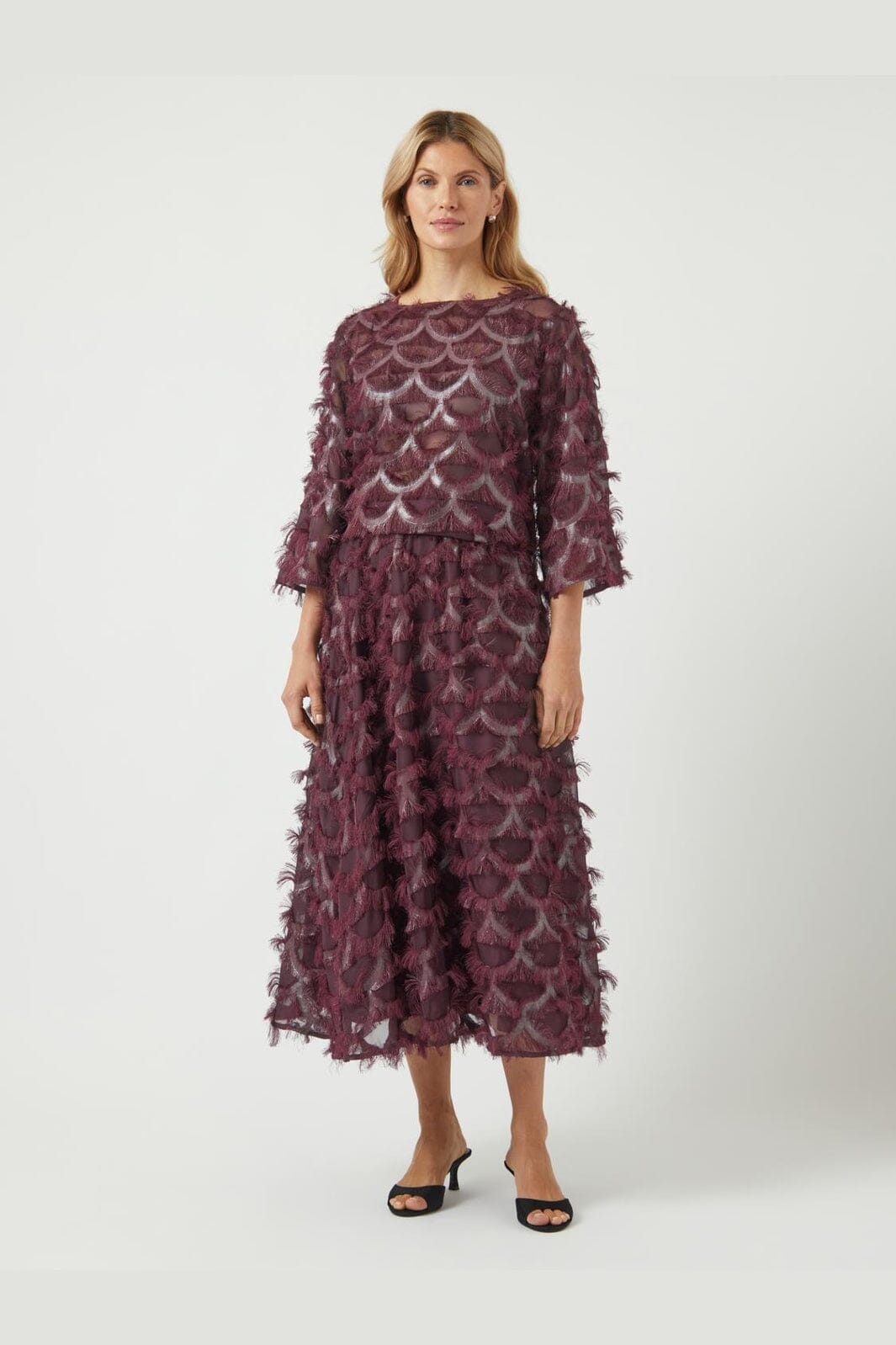 Rok van YAS, gemaakt van 100% polyester in een diepe bordeauxrode tint met metallic print en franjes over het hele oppervlak.