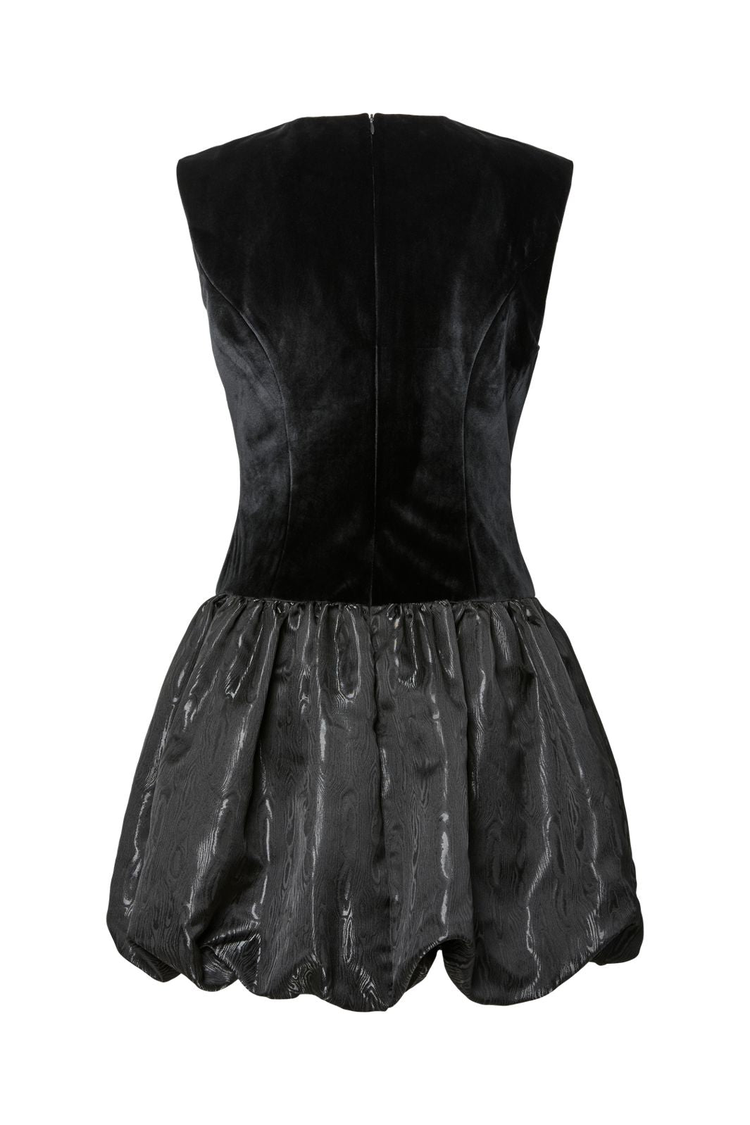Zwart jurkje van YAS met een ballonvormige rok en ruches. De jurk is mouwloos met een gestructureerd bovenstuk van velours en een rok met patroon.