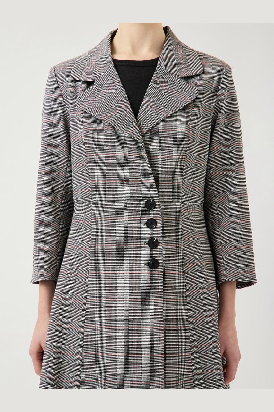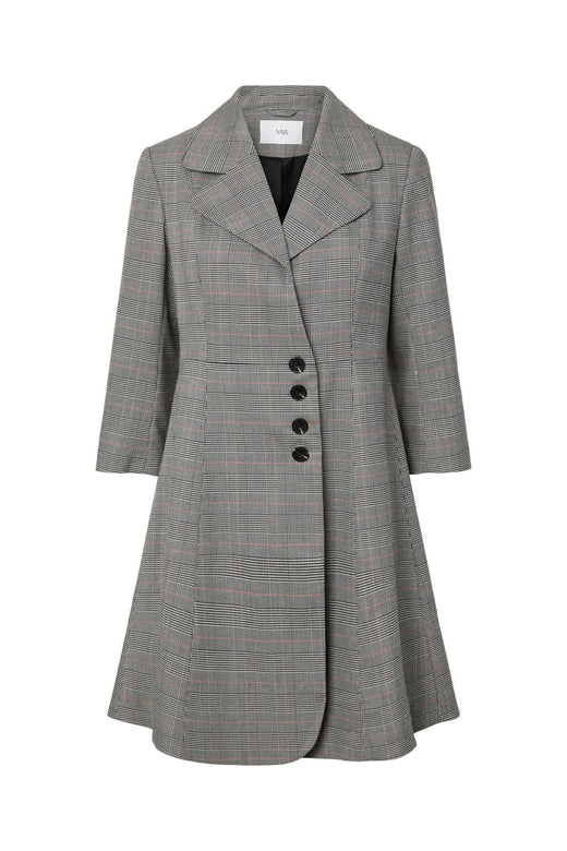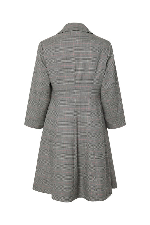 Wikkeljurk van YAS in lichtgrijs met een ruitpatroon. De jurk heeft een overhemdkraag en knopen aan de voorkant. Ze is ontworpen voor zowel feestelijke als formele gelegenheden.